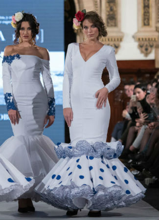 En 2018 la tendencia de las mangas del traje de flamenca sin volantes se implanta de forma definitiva. Más cómodas, estilosas y permite que el traje se lleve el protagonismo en la falda o a otros detalles. Cuestión de gustos. Estos diseños son del ganador del certamen de noveles de la provincia de Sevilla 2017, Daniel Robles, que ha debutado en We Love Flamenco 2018. Foto: Aníbal González