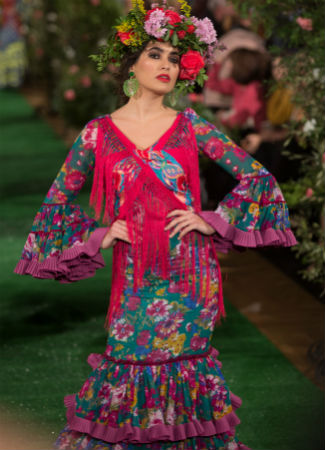 El desfile de Rocío Peralta fue toda una declaración, la mayoría de las modelos lucieron los mantoncillos cruzados en el pecho y sujetados con alfileres (o broches) en cada hombro. Aunque es habitual verlos así colocados en niñas pequeñas, resulta refrescante en la moda flamenca para adultas. Un detalle que puede suponer un cambio total al look final. Foto: Vanessa Gómez