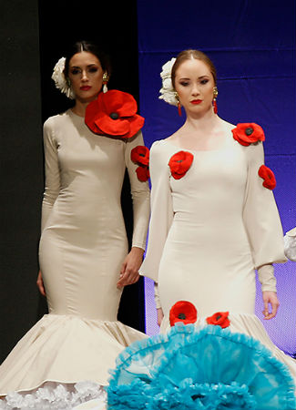 En la imagen vemos diseños de Pedro Béjar, pero él solo ha sido uno de tantos diseñadores que han apostado por flores de tela (más o menos grandes) que sirven como decoración para los trajes de flamenca. Adornan cuellos, faldas, partes del cuerpo, mangas, etc.