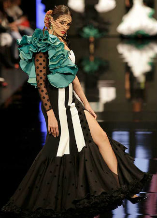 Otro de los tipos de faldas o trajes de flamenca que más se han repetido durante las pasarelas ha sido la abotonada o con una apertura central. Este diseño permite mostrar las piernas mientras andas y ofrece más ligereza al diseño. Este es de la diseñadora Verónica de la Vega en SIMOF 2018. Foto: JM Serrano/ Vanessa Gómez