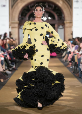 Esta tendencia se ha quedado y supone ya una opción -no muy cómoda, es cierto-, pero sí muy espectacular. Consolación Ayala nos ofrece con este modelo muchas tendencias en una: volantes en falda y mangas con volumen (crean una especie de clavel cuando se mueven) en contraste de color, un traje amarillo y de lunares. Y el detalle de la lazada en el hombro completa el look.