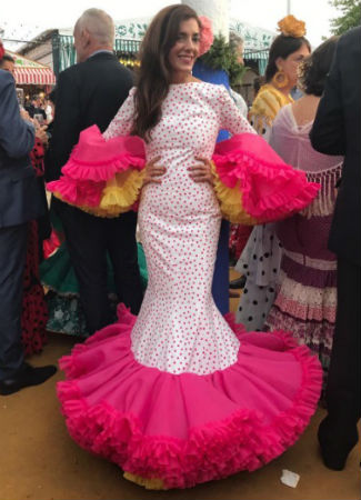 Nuestra colaboradora y blogger, Yose Delgado, del blog de Hanging in my closet ha sorprendido en el Real con un precioso traje de flamenca de la diseñadora Patricia Bazarot, pequeños lunares fucsias sobre fondo blanco y volantes con volumen en fucsia y amarillo.