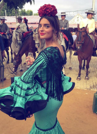 La ganadora de Gran Hermano 14, Susana Molina, afincada en Sevilla es una habitual de la Feria de Abril. Este año ha elegido un traje de Leticia Lorenzo turquesa y negro de corte clásico. Lo ha combinado con mantoncillo negro de transparencias y flor roja.