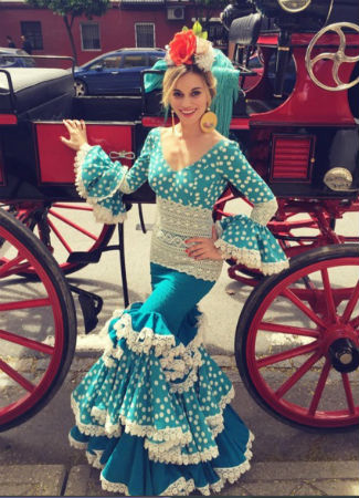 Otro de los looks de flamenca de la conocida actriz de televisión, cine y teatro ha sido un traje de flamenca de Sonibel. Turquesa de lunares blancos, con cintas y madroños. Un traje muy favorecedor que combinó con flores en naranja y blanca y con grandes pendientes redondos.