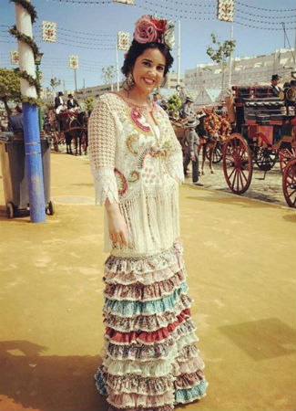 La bloguera e ilustradora cordobesa Elena Rivera (Mamá de mayor quiero ser flamenca) acudió a la Feria de Abril con un original y colorido diseño de Raquel Terán que completó con una rebeca y flores en diversos colores en el centro de la cabeza. Foto: M. Valverde.