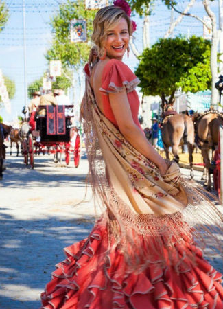 María León, hija de los marqueses de la Cañada, vuelve siempre que puede a su Sevilla natal. Esta bloguera e influencer del mundo de la moda apostó por un diseño de Pepa Garrido para su paso por la Feria 2016. De manga corta y combinando el color melocotón con el beige.