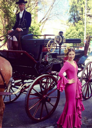La mujer de El Cordobés sorprendió con un original diseño de Vicky Martín Berrocal en la Feria de Sevilla. La venezolana estaba muy cómoda con este traje de corte sencillo y muy favorecedor en rosa que combinó con algunas rosas dorada colocadas de forma asimétrica.