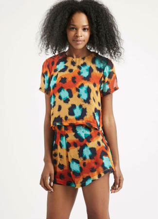 Topshop propone que lleves un total look de leopardo con dos piezas: crop top y short. Estas prendas mezclan el leopardo clásico con el color celeste y naranja. Un conjunto juvenil con el que te llevarás todas las miradas, solo necesitas un par de botines negros con plataforma.