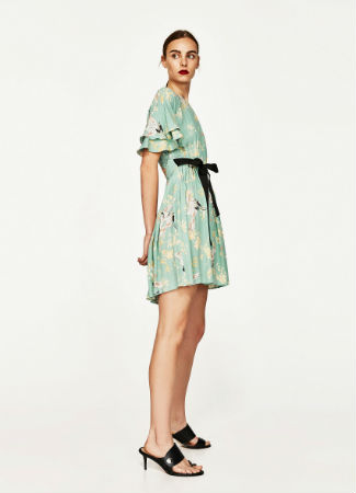 Este vestido corto color verde agua con estampado de garzas es perfecto para las que buscan un look romántico y juvenil. Además, nos encanta el lazo negro en la cintura y el detalle «cut out» de la espalda (una apertura) que le da un punto sexy y muy a la moda. La manga corta en forma de doble volante lo hace perfecto para la primavera. También podrás llevarlo con un toque más elegante o informal según los complementos.