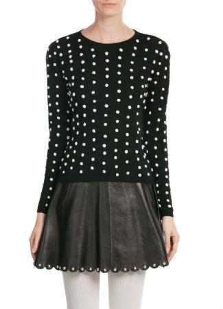 Una de las posibilidades es dejar que los pompones salten de los complementos a la ropa. Este jersey de RED Valentino es una propuesta con mini pompones blancos sobre fondo negro, más sutil y elegante que otras opciones con pompones mucho más llamativas.