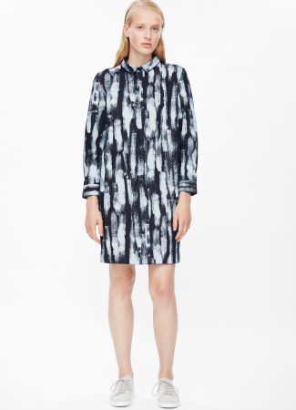 Un estampado original y una prenda de moda, el vestido camisero. Con este de la firma COS demostrarás saber llevar el cambio estacional con estilo. Manga larga, pero corto. Porque aún no hace tanto calor, pero tampoco tanto frío. Puedes combinarlo con deportivas como hace la modelo en la imagen, pero también con sandalias o botines.