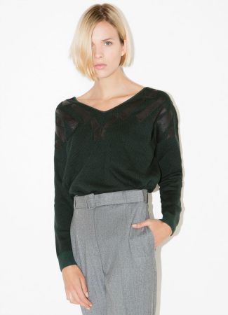 La firma Uterqüe propone para estos meses un jersey de seda y algodón en color verde militar con detalles de piel en los hombros. En el diseño destaca un amplio cuello de pico y el corte ajustado. Puedes combinarlo con un pantalón vaquero pitillo o de campana, con un palazzo, con una falda de piel, etc. Es una prenda versátil y que merece la pena lucirla sin abrigos ni chaquetas encima.