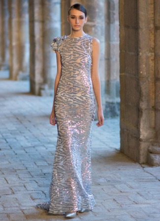 La colección del diseñador sevillano buscaba el punto sexy femenino a través de las transparencias. De todos los modelos, uno destaca por convertir las mini lentejuelas plateadas en un estampado de zebra sobre el cuerpo de la novia. No se tiene por qué ir de blanco y también se puede llevar un original print en un vestido de cortes simples.