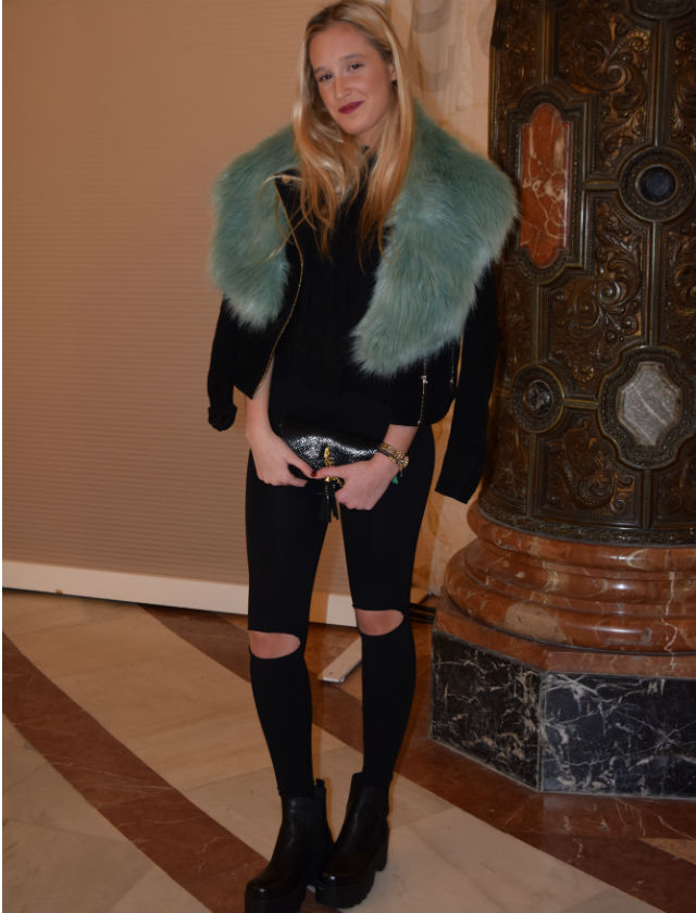 Esta azafata y estudiante de Derecho nos llama la atención por su look con toques rockeros (las leggins rotos y las grandes plataformas) y la estola de pelo de un color atrevido que completaba el estilismo a la perfección. La chaqueta es de Mango, la blusa de Zara, las botas de Un paso más, el bolso de Garbo, los leggins de Calcedonia y la estola de Pull and Bear.
