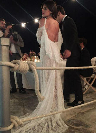 Para la fiesta posterior al enlace, Dulceida se cambió de vestido y se puso uno de fiesta largo, en blanco también, de encaje, que dejaba su espalda al aire de la misma firma que el primero, Ze García. Este tenía un aire ibicenco que encajaba perfectamente con el lugar del enlace.