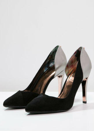 ¿Quién no quiere en su zapatero unos salones negros de ante que se salgan de lo común? El modelo Giulia de Ted Baker va a robarte el corazón por su detalle de tacón y parte trasera en plata, por su forro de estampado floral... Sus ocho centímetros de altura lo convierten en el calzado perfecto para un look de invitada de boda, un vestido de noche o incluso unos jeans.
