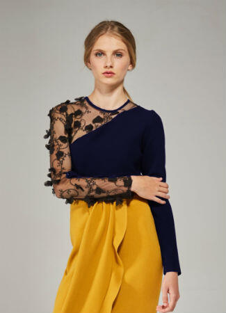 El modelo Casia es un top de la firma Coosy, confeccionado en crepé elástico azul marino y con cuello redondo con vivo en azul marino. Lo que llamará tu atención es su asimetría, con una manga de tul con pétalos negros en contraste con el azul y que la hace original y diferente. Será perfecto para un look de noche tanto con falda como con pantalón.