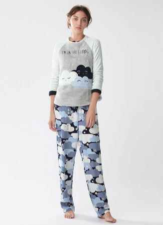 Si te apetece renovar los pijamas, ¿por qué no algo bonito y calentito de la nueva colección de Oysho? Este con un divertido mensaje y dibujo de nubes tiene la camiseta de polar y un pantalón cómodo con el mismo estampado en tonos azules, blancos y grises. Aprovecha los descuentos para tenerlo más barato.