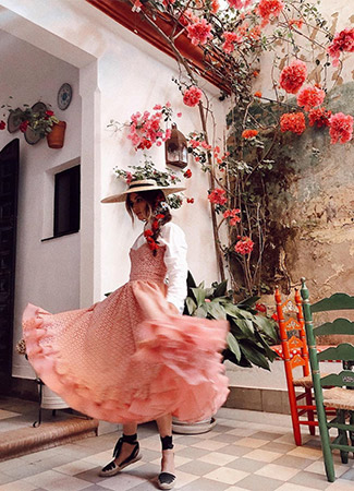 La influencer conocida como @madamederosa ha mostrado un segundo look firmado por Cristo Báñez para esta romería de El Rocío 2019. Se trata de uno de los diseños de la última colección del modisto, presentada en Flamenca D'Doñana 2019. Un vestido palabra de honor con tejido troquelado en rosa nude que ella ha combinado con una blusa blanca.