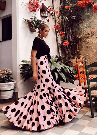 La hija de Vicky Martín Berrocal y El Cordobés ha posado con este look en el patio de la casa de su madre, en Almonte. Luce una bonita falda entallada rosa pastel con lunares negros y volumen desde la rodilla, que ha combinado con un top negro anudado.