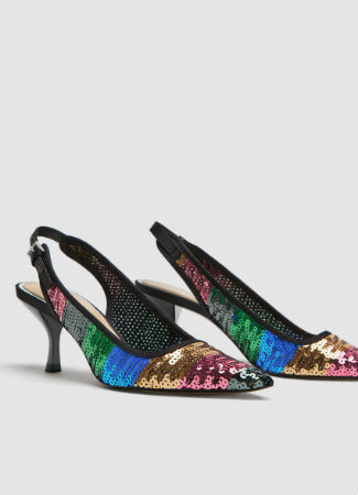 Estos tacones de Zara pueden convertirse en tus favoritos por diferentes motivos: su tacón de 6 centímetros, sus lentejuelas de rayas de colores, su corte destalonado y su aire fiestero. Imáginalo para aguantar horas y horas de fiesta en tu próximo evento o boda.