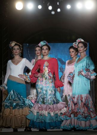 Otra de las habituales es la mezcla de estampados. En esta hay varias firmas de moda flamenca que destacan como Flamenca Pol Núñez y, en la imagen, Lola Azahares. Es habitual ver sobre la pasarela trajes de flamenca que combinan tejidos diferentes y también estampados: flores, lunares, rayas, lisos... Lo más importante de estas mezclas es que consigan una uniformidad elegante y flamenca. Foto: Aníbal González