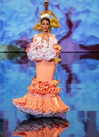 No solo lo ha utilizado Alejandro Santizo, nos hemos encontrado con diferentes tonos de naranja (más empolvado que vibrante) en muchas colecciones de moda flamenca de 2019. Como base de un estampado o liso como en este caso y combinado con blanco, un clásico que no falla.