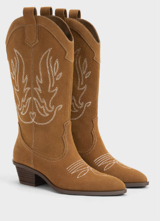 Llevamos viéndolas desde principios de 2019 y este otoño-invierno va a ser la explosión definitiva y necesitas un par en tu armario. Podrás combinar tus botas cowboy pantalones, faldas o vestidos boho. Estas son de piel marrón con los bordados clásicos, tacón bajo muy cómodo y acabado en punta.