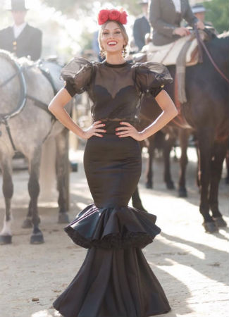 La influencer Carmen de la Cruz, Bridalada, que ha sido desde el principio la imagen de Johanna Calderón no falló en su visita a la Feria de Abril y lució uno de los trajes de flamenca estrella de la colección 2019. Lo combinó con pendientes de Acus y tres sencillas rosas en el centro de la cabeza. Foto: Fernando Mañas. Chic too Chic