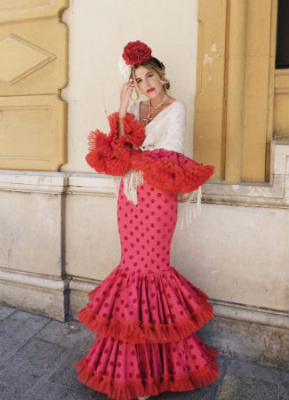 La influencer Carla Hinojosa promete varios looks espectaculares este año. Para una sesión de fotos previa ha apostado por un traje de flamenca de Rocío Peralta que combina con estilo el rosa y el rojo de lunares, mantoncillo blanco bordado de Barón Terry y joyas de Brilliant Bcn.