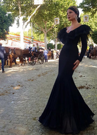La cordobesa no se pierde el domingo de feria con un traje de flamenca negro muy favorecedor de Mimac Design y complementos de Miss Lolita. Nos llama la atención la elegancia de los volantes de tul que nacen del escote en pico y la sutileza del único volante de la falda.