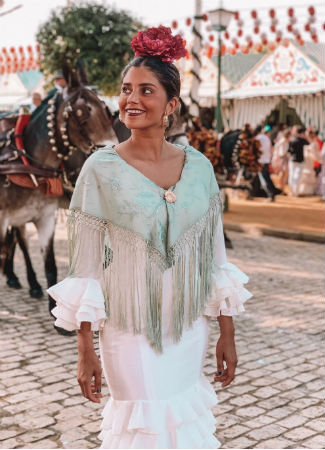La joven influencer está feliz de por fin haber podido venir a la feria, tras varios años intentando cuadrar su agenda. Luce un traje de flamenca de corte clásico blanco con volantes de capa que combina con mantoncillo bordado de color verde agua y flor en tono rojo empolvado.