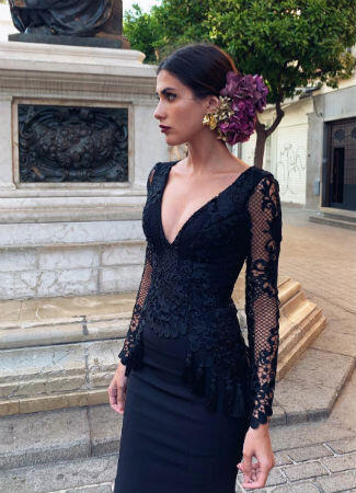 Mery Turiel vuelve a confiar en los diseños de Rosa Pedroche para vestir de flamenca en la Feria de Abril. Además, esta vez ella ha formado parte del proceso creativo, según cuenta. Se ha decantado por el negro con un amplio escote en V, parte superior de encaje, mangas semitransparente. Pendientes dorados y flores moradas.