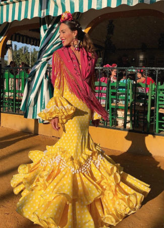 Siempre se espera el traje de flamenca de esta influencer sevillana con ilusión. El primero que ha elegido Rocío Osorno este año ha sido un diseño en amarillo (uno de sus colores predilectos esta temporada) de la firma Sonibel que luce con pendientes de Chocolate Complementos y mantoncillo de La mar de cuqui.