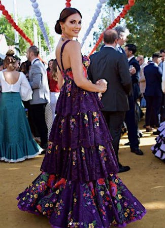 La sevillana Elena Gómez, casada con el futbolista Javi Gómez, también es una amante de las tendencias en moda flamenca y lo demuestra con este traje de Pablo Retamero y Juanjo Bernal el domingo de feria. Talle alto con grandes volantes, estilo corsé con escote corazón, tirantes y un tejido bordado morado muy llamativo. Sin duda, no pasa desapercibida.