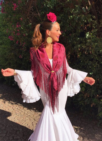 El segundo traje que ha elegido la conocida diseñadora ha sido un diseño blanco de Aurora Gaviño (con la que lleva colaborando varios años). Repite con el color del mantoncillo, tono rosado bordado y una flor del mismo color en el centro de la cabeza. Como peinado, una sencilla coleta.