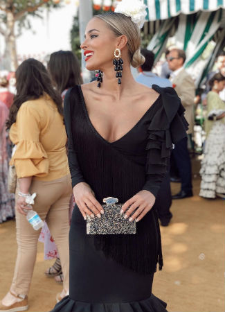La joven conocida por su faceta televisiva como princesa en el reality «Un príncipe para... » es ahora una influencer centrada en moda y lifestyle Su traje de flamenca fue de Anguas Ruiz, un diseño negro con flecos, gran escote y asimetría en los volantes de las mangas.