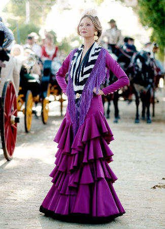 La creadora de la firma de complementos Lamágora es una de las referencias en moda flamenca en Andalucía. Su estilo ha conquistado a muchos diseñadores que colaboran con ella para crear sus colecciones de pendientes de flamenca exclusivos. Nos encanta cómo combina su traje de flamenca color buganvilla de Johanna Calderón con mantoncillo de rayas blancas y negras con flecos morados. Por supuesto, pendientes de Lamágora. Foto: Chic too chic