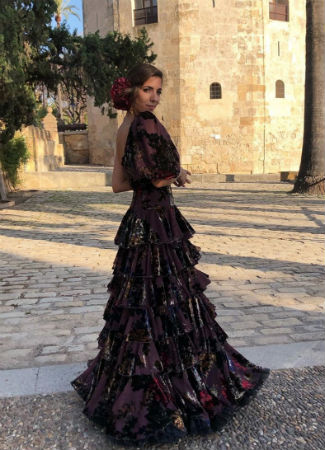 Al frente de la cuenta de inspiración flamenca @flamencasyvolantes se encuentra Patricia Nakib que ha comenzado a salir en su perfil de Instagram este mismo año. Para su primera Feria de Abril ha apostado por Rosa Pedroche con un traje de flamenca asimétrico, manga globo, talle alto y volantes medianos.