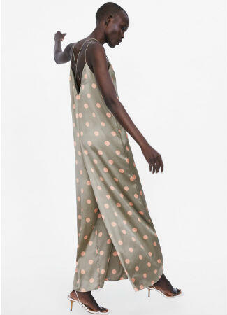 Si quieres ir con un mono, esta propuesta de Zara es perfecta. Un mono largo con escote en la espalda y tirantes de tipo espagueti cruzado. Es muy fluido y llamará la atención por sus patas anchas, parecerá un vestido largo. Nos encanta el color topo combinado con los lunares de color maquillaje.
