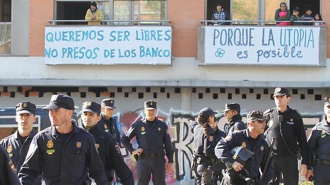 La Policía Nacional, con las viviendas de la corrala al fondo