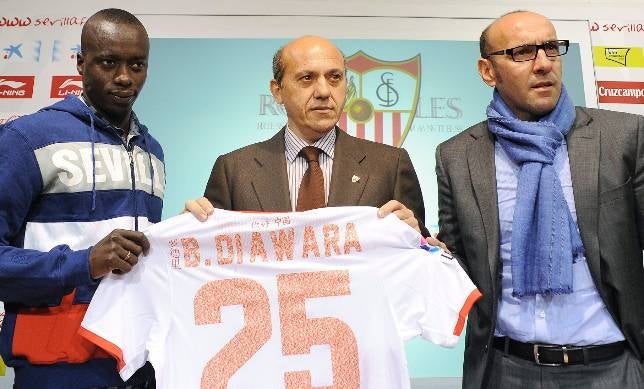 El nuevo fichaje del Sevilla, Babá, posa con el presidente del Sevilla, Del Nido, y el director deportivo, Monchi