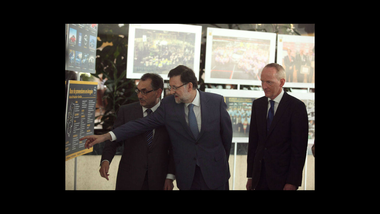 Mariano Rajoy, junto a la presidenta del Gobierno de Aragón, Luisa Fernanda Rudi, y el presidente-consejero delegado de GM Europa, Karl-Thomas Neumann (i), ante un Opel Mokka - Fabián Simón