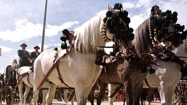 Un coche de caballos enjaezado a la calesera, con borlajes y cascabeles, en el real de la Feria de Abril