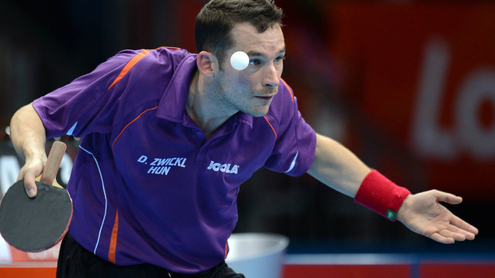 El alemán Timo Boll enfrenta al rumano Adrian Crisan durante la competición