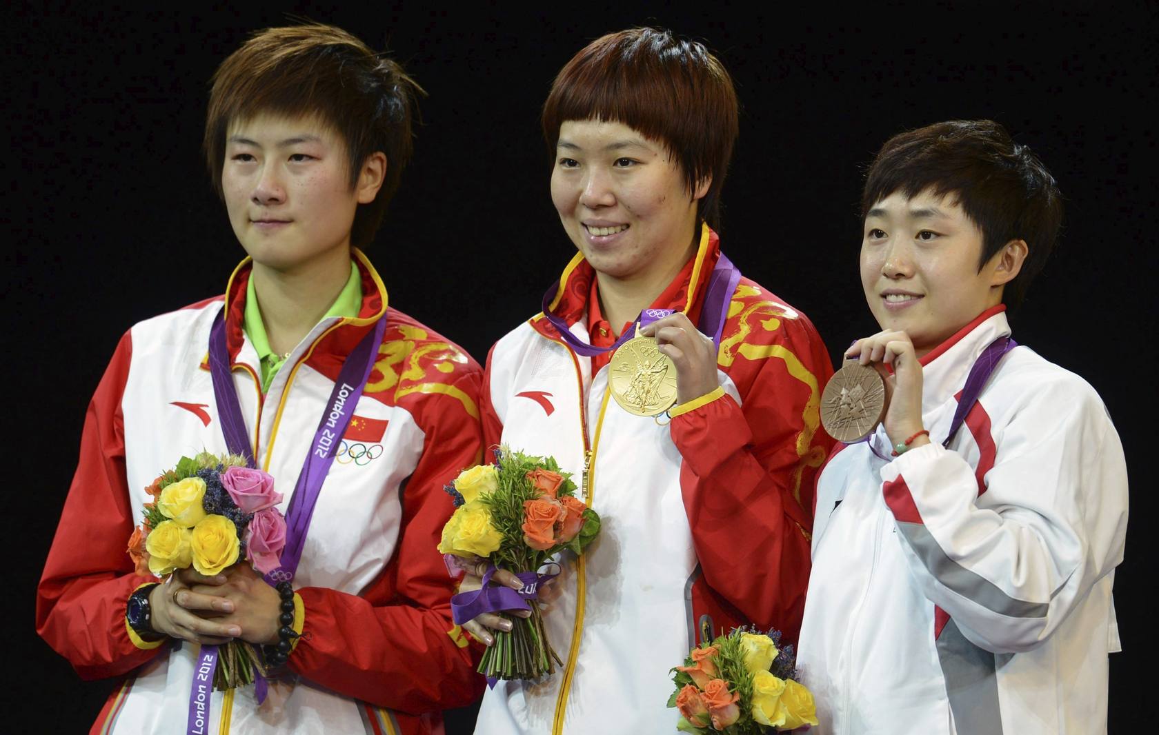 La china Li Xiaoxia devuelve la pelota a su compatriota Ding Ning durante el partido por la medalla de oro femenina