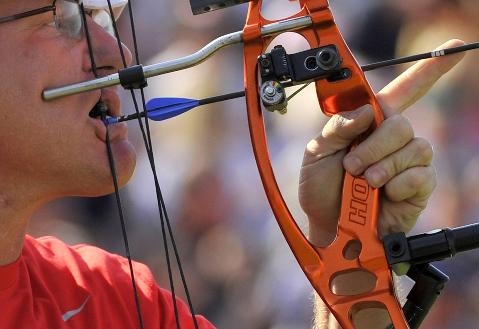 El atleta estadounidense Stutzman se dispone a efectuar un lanzamiento con su arco en los Juegos Paralímpicos de Londres