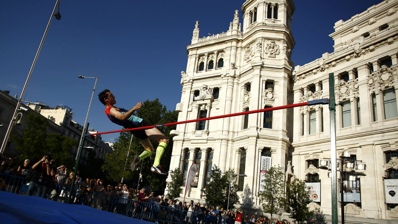 Una de las exhibiciones de la tarde corrió a cargo del saltador de altura y campeón de España Javier Bermejo, que saltó 2 metros a una hora simbólica, las 20.20, junto al Palacio de Cibeles