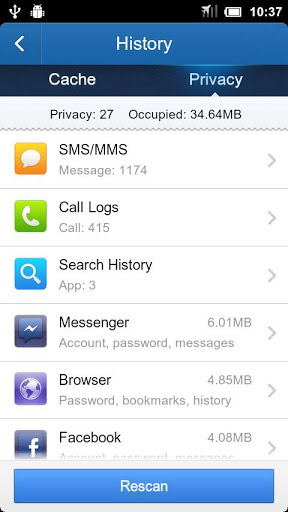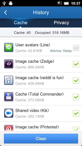 Al margen de la gestión de aplicaciones del sistema, con Clean Master también dispondremos de un sencillo y práctico gestor de nuestra privacidad web ya que la app permite eliminar la caché y los históricos de navegación. Así estamos libres de que un posible malware pueda hacerse con información personal de nuestras cuentas y contraseñas o datos que se hayan quedado guardados en páginas de comercio electrónico o redes sociales.