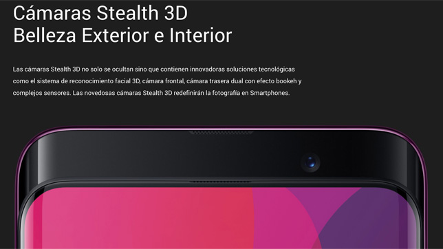 El diseño es el principal atractivo del nuevo teléfono de Oppo gracias a su estructura deslizante que oculta las cámaras, bautizado como Stealth 3D, que permite un frontal sin notch sin tener que prescindir de soluciones tecnológicas como el sistema de reconocimiento facial 3D, o efecto bookeh gracias al sensor dual. La compañía garantiza 300.000 usos de esta herramienta e incluye tres años de garantía con el seguro Oppo Care. El impresionante frontal -recordemos: 92.25% de superficie utilizable- se completa con un cuerpo con trasera de cristal con acabado degradado disponible en dos colores: Bordeaux Red y Glaciar Blue. Sus dimensiones son de 156.7 por 74.2 por 9.6 milimetros y su peso de 186 gramos.